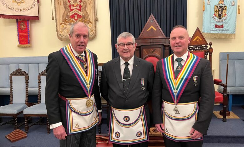 PGM, R W Bro Philip Voisey, Commander, W Bro Paul Jarvis & Candidate, Bro Mike Holman.