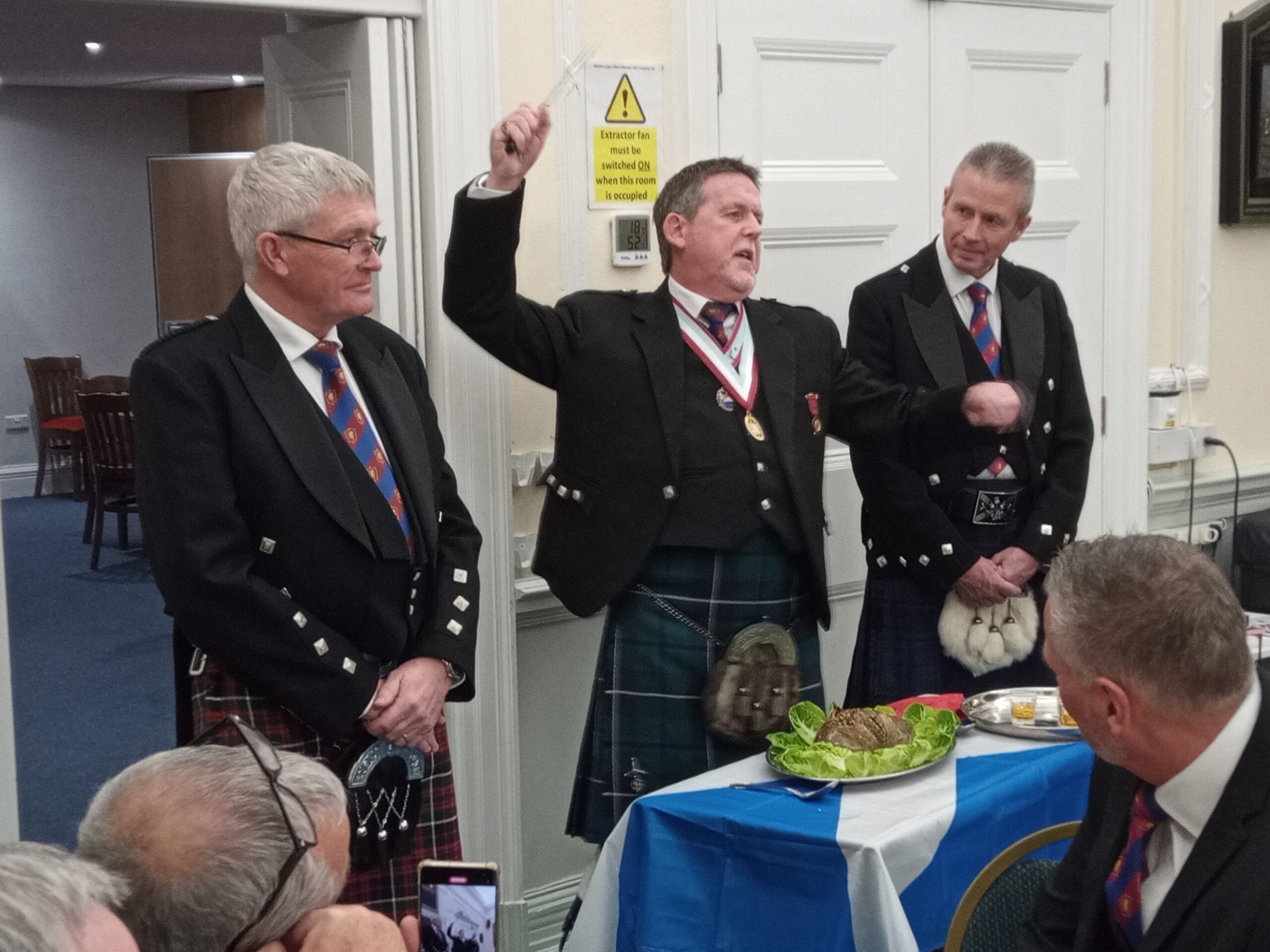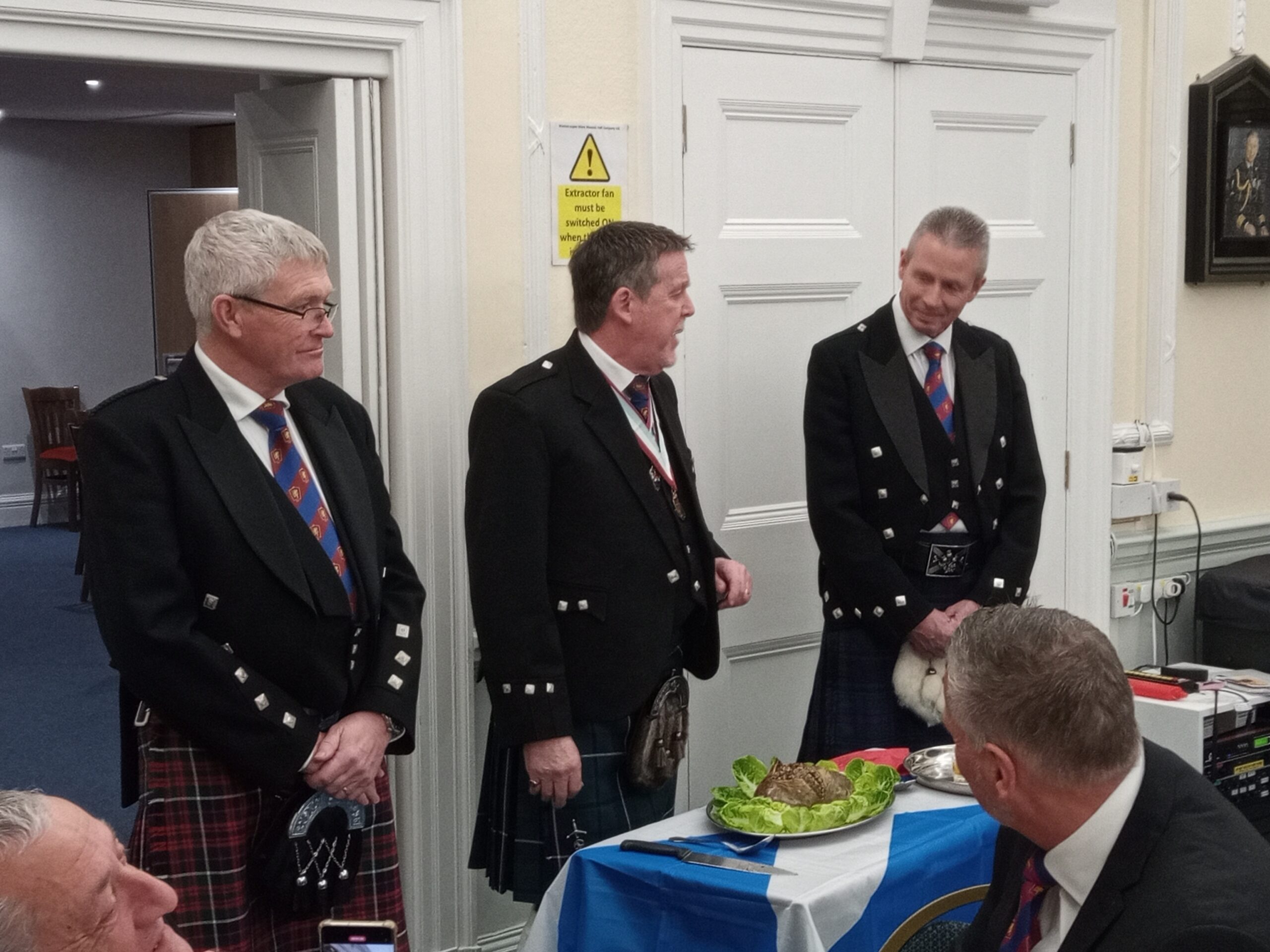 The Worshipful Master, Ian MacDonald and both Deacons – Scott McKechnie and George Collington, being Scotsmen, wore their kilts in honour of the anniversary of Robbie Burns’ birthday, and at the Festive Board, the Beastie was duly sacrificed according to tradition and consumed with relish (“gravy” actually!).