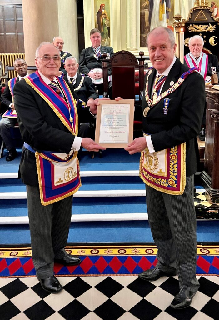 The PGM’s next task was to present W Bro Trevor Burton with his 30 years long Service certificate before Presenting W Bro Graham Jeffery with his MBF Vice patrons festival jewel.