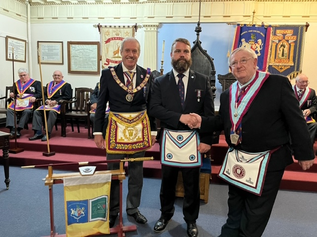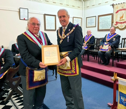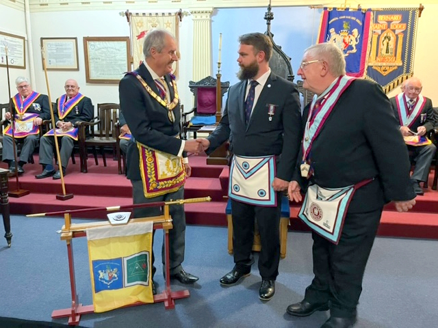 The lodge advanced Bro Sam Sheasby into the Mark. Sam, who is an active member of the Adair club, will be a good asset to the lodge. The main picture shows Sam being welcomed by the Master Malcolm Pedley with the PGM in attendance. At the meeting the PGM surprised Phil Thresher when he presented him with his 30 year certificate, thanking Phil for his tremendous support of the Mark degree. We all retired to enjoy a lovely festive board along with the usual excellent hospitality at Minehead.