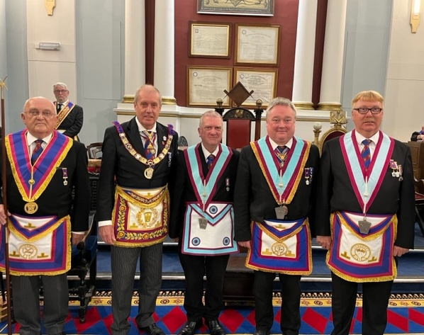 Kieran Hughes took the chair of the lodge following a very fine installation ceremony by Charlie Barker. Kieran is pictured above with his wardens Simon Johnson and Ian Clift with Phil Voisey and Neil Tinkley.