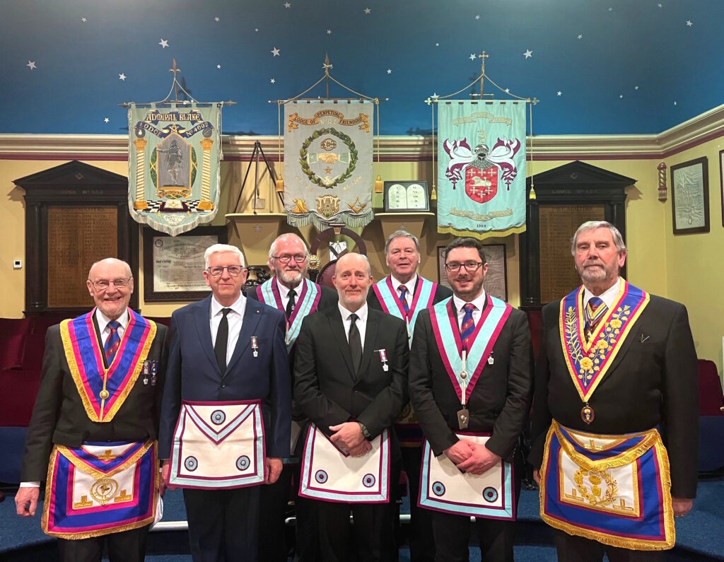 Also pictured are Worshipful Brother Dave Preece, Brothers Barrie Palmer, Theo Guy and Craig Pyne on the front row, who joined during the past year together with Worshipful Brothers Stewart Morgan, Dave Smith and VWBro Ray Johnstone Smith, the Past Masters of the Lodge who assisted at their Advancement.