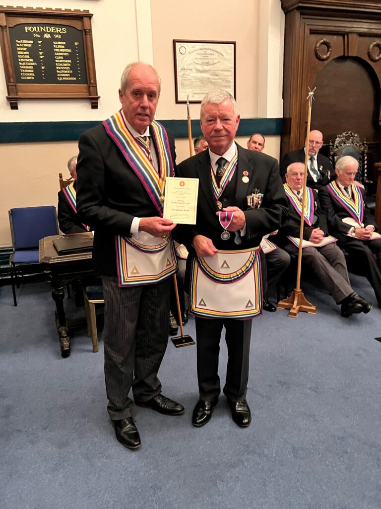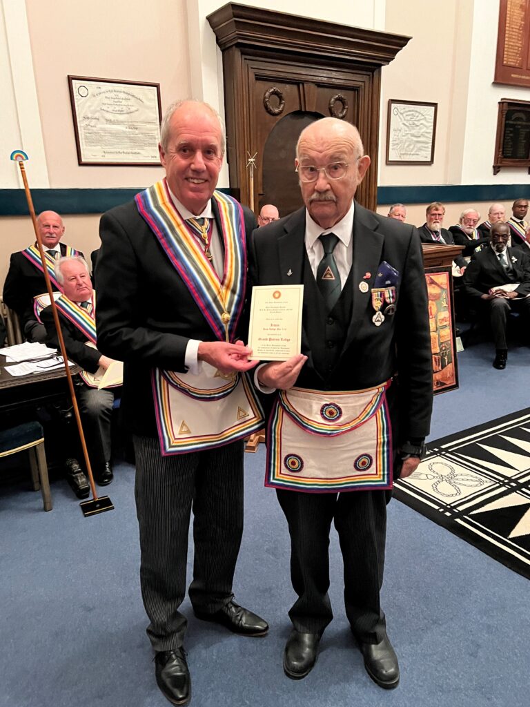 During the meeting, the PGM presented two lodges with their Festival 2028 awards (see photos below) a Grand Patron Award for Irwin Lodge and a Vice Patron Award for the Exmoor Lodge.