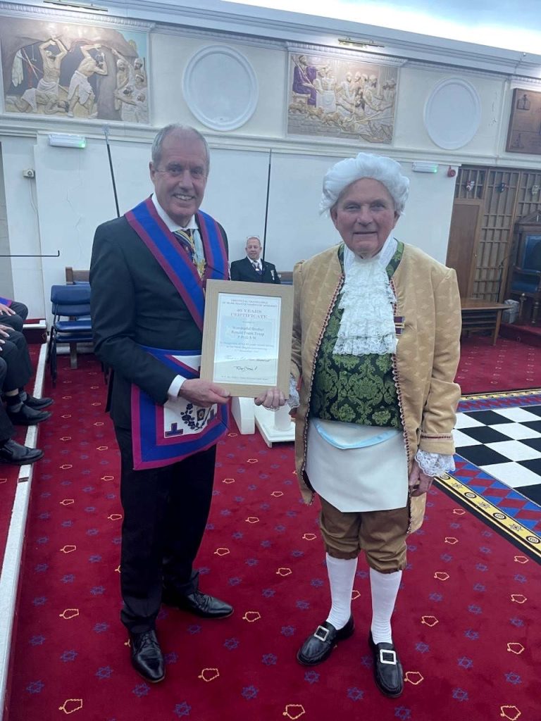 The Provincial Grand Master was delighted to be able to present John Ryemill with his Grand Lodge Certificate, being the newest Member of the Lodge and was then very pleased to be able to present one of the SAMMs Team, namely Ron Troup with his 40 Year Certificate, celebrating 40 very enjoyable years in the Mark Degree.