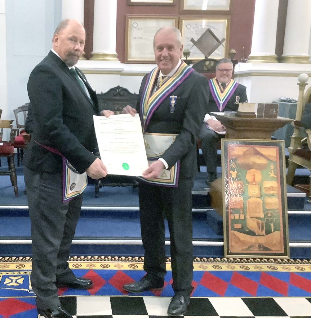 On completion of the ceremony the PrGM was invited to present Bro Grant Peckham with his Grand Lodge Certificate. He was Elevated at our October meeting with Bro Derrick Griffin who unfortunately was unable to be with us on the night to receive his certificate.