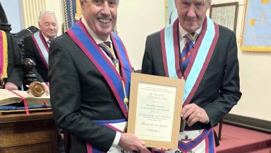 Finally, the PGM also had a ” Grand Patron ” collar for WBro Jimmy Durant who unfortunately passed away back in October. Jimmy was always a very strong supporter of the Mark degree, and very generous towards this and the Royal Ark Mariner Lodge. WBro Rod Green will visit his widow Sigrid to pass on this collar he so richly deserved.