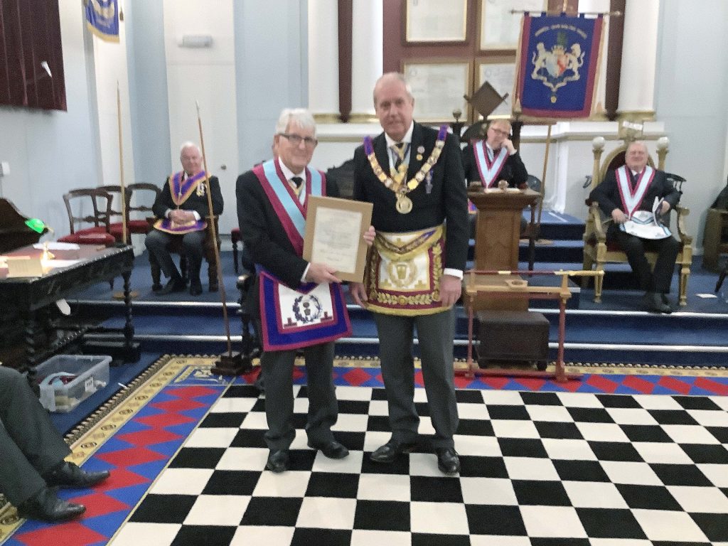 At the conclusion of the ceremony, the PGM was invited to present a 40 year certificate to WBro John Phillips PGJO, who was Advanced into the Mark Degree on 2nd January 1986 in The Hailsham Lodge of MMM No 1234. John has been relocated to Somerset for the past 3 years and has been active within the Province.