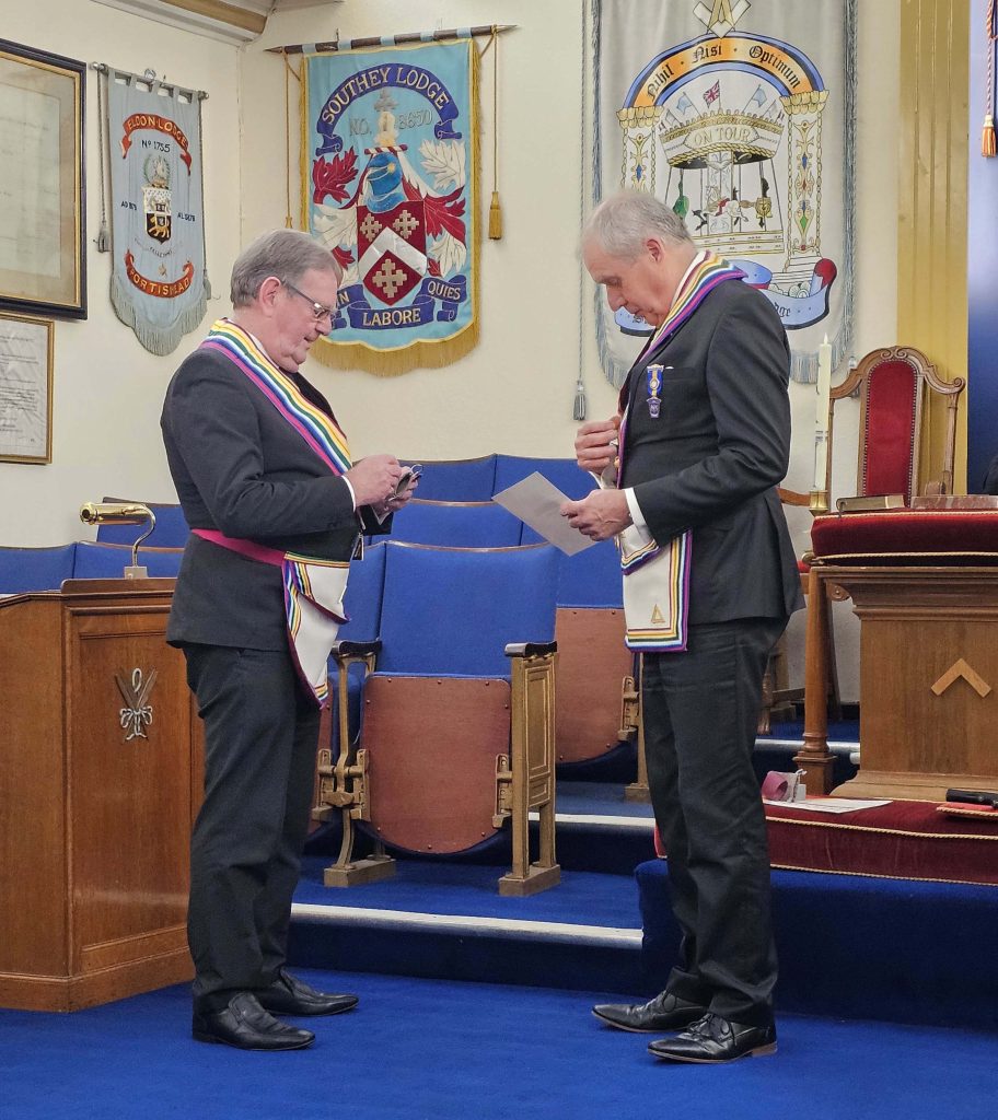 To top off the evening, the PGM then Presented the Club Chairman with a set of Cufflinks and matching tie pin together with a certificate for completing phase 1 and phase 2 of visits to every Mark and Royal Ark Mariner lodge in the Province. Graham thanked him and commented that the matching set would become much sought after and thanked all members for their support.