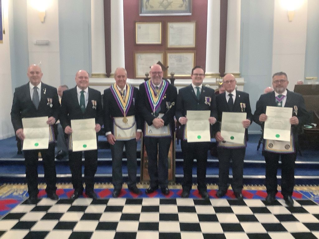 His first task was to invite the PrGM to present five Grand Lodge certificates to our new brethren. The PrGM admitted that this was the first occasion that he had the pleasure in presenting five GLCs at one meeting. The other GLC had been presented to Bro Grant Peckham at our meeting in January.